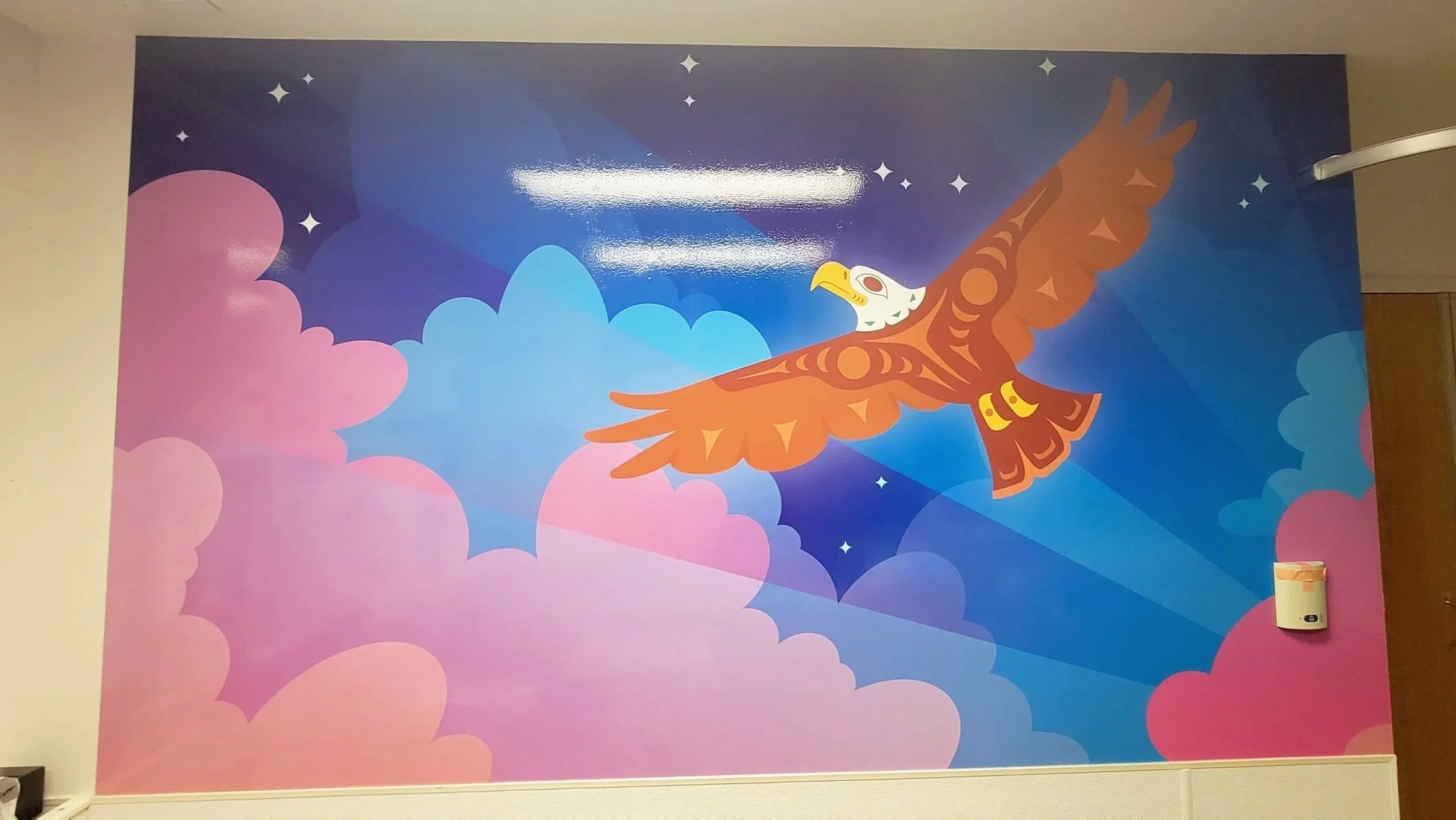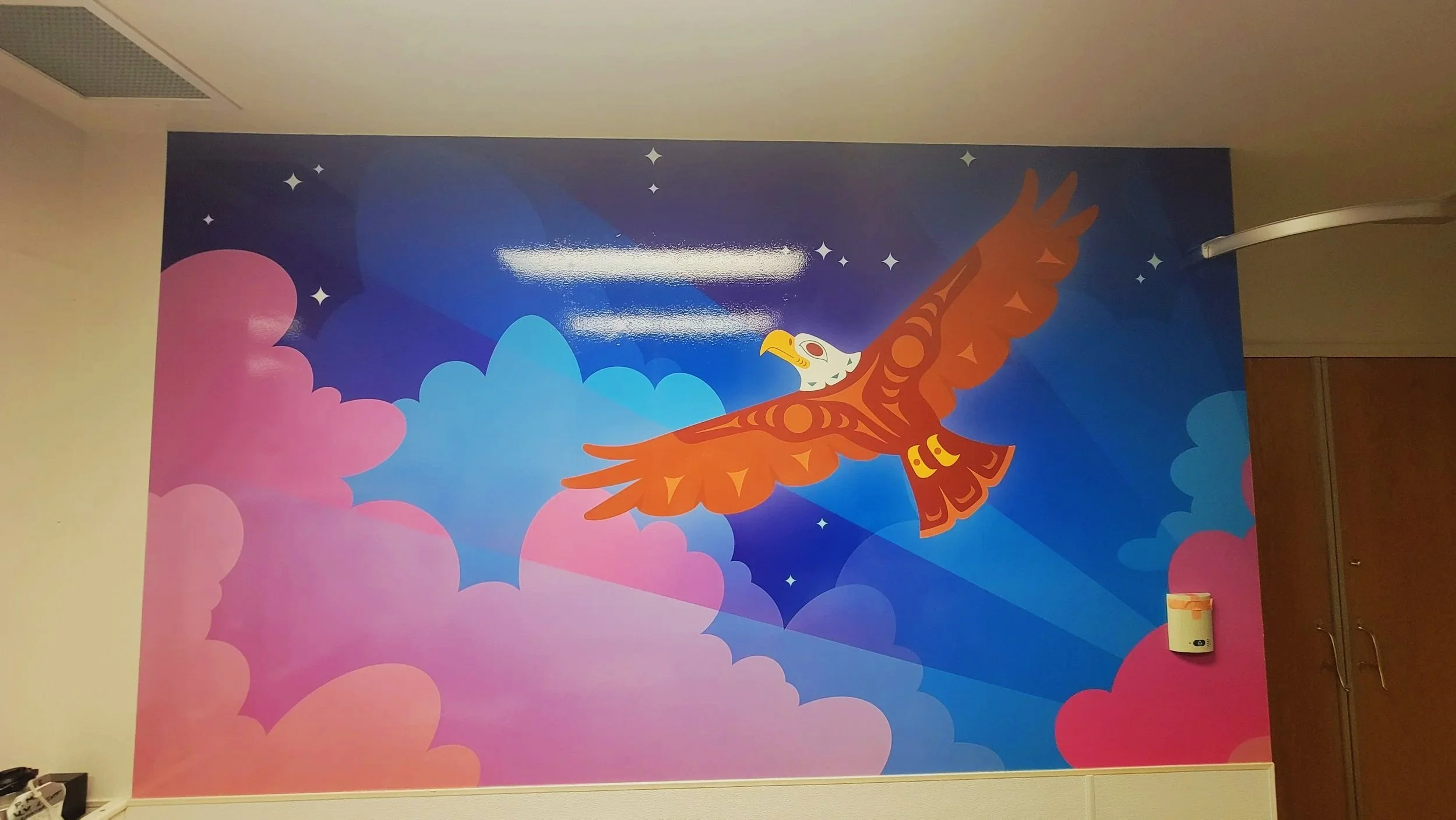 This mural, created for the Acute Care Ward at Vancouver General Hospital, blends traditional Coast Salish art with universal symbols of healthcare to convey a powerful message of unity, healing, and shared care.