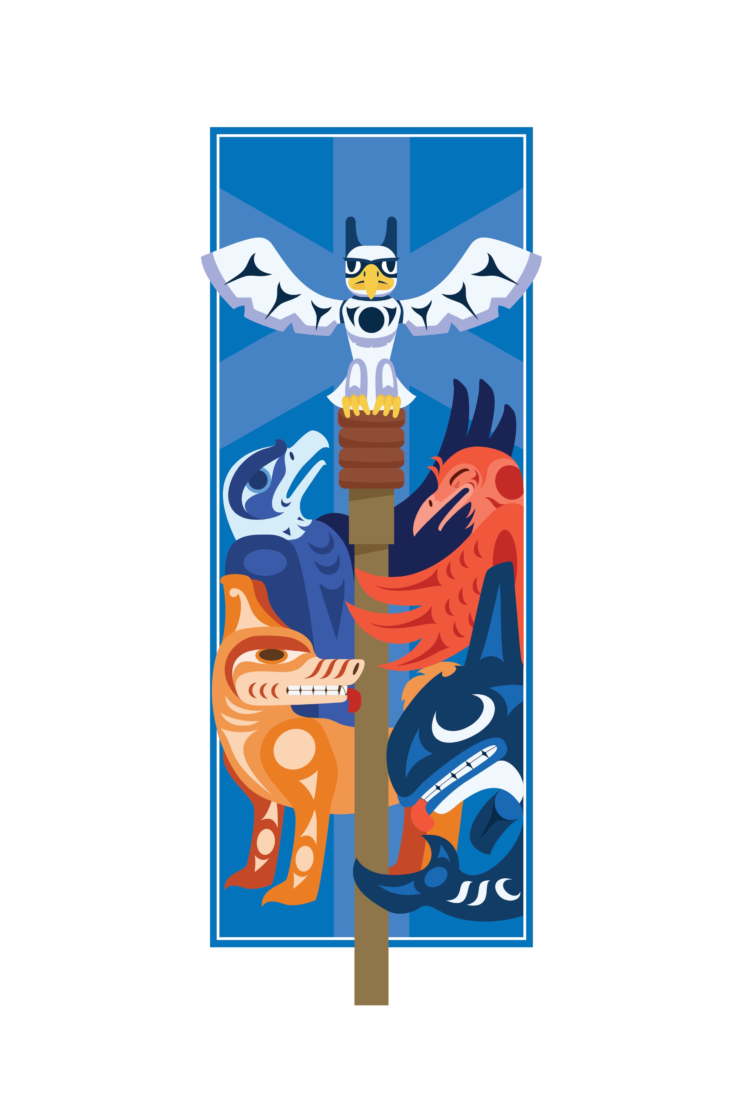 At the heart of the artwork is a large talking stick, an emblem of respectful dialogue and collaboration deeply rooted in Indigenous traditions. The talking stick features Ininyaxa7n: The Thunderbird at its apex, with its wings outstretched in a gesture of protection and guidance. The Thunderbird, a figure of immense power and wisdom, symbolizes the transformative strength required to nurture both physical and spiritual health.