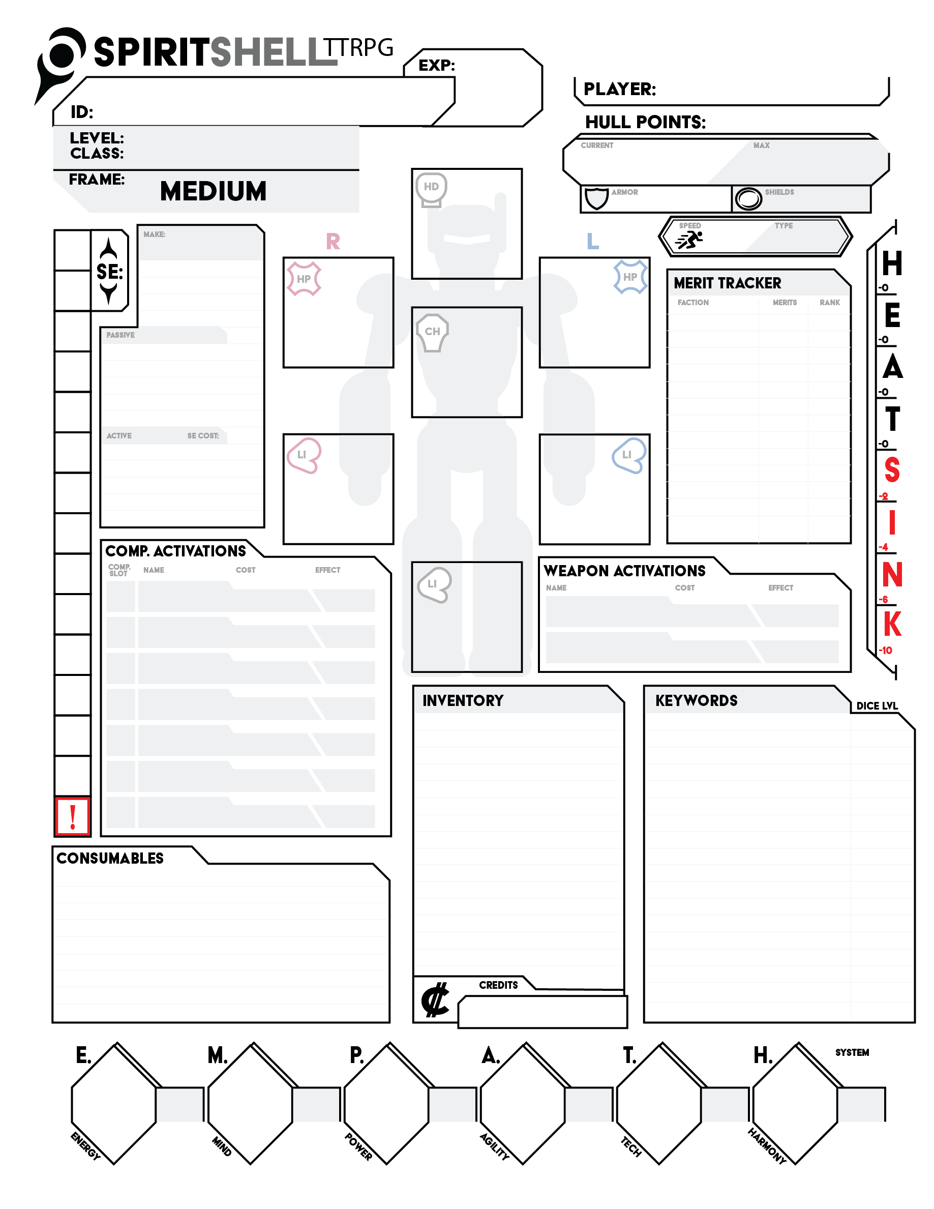 In order to play Spirit Shell TTRPG you will need to have what is known as a Player Character (PC). This section will take you through the step-by-step process of creating a PC which includes picking: a class, a frame, a make, choosing your starting components, and finally adding some flair and narrative hooks through character backstory.